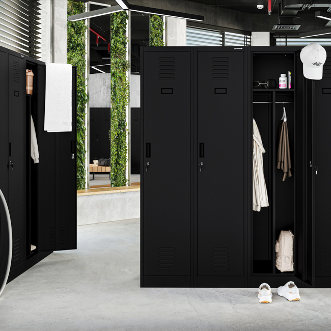 Větrací otvory ve dveřích umožňují volnou cirkulaci vzduchu a eliminují riziko zachytávání nepříjemných pachů uvnitř skříně. Vaše oblečení tak zůstane svěží, i když bude ve skříni viset celý den. Kromě toho jsme větrání navrhli tak, abyste ve skříni mohli skladovat i obuv. Držáky na vizitky na dveřích pomáhají zaměstnancům při organizaci jejich věcí.
