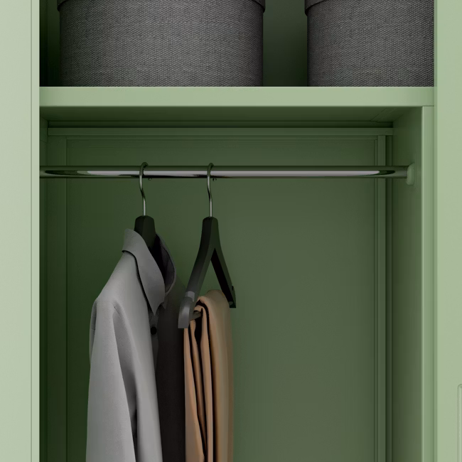 Der DAWID Schrank besteht aus verschiedenen Zonen, die Ihnen helfen, sich zu organisieren. Die hohe Kleiderstange schützt Ihre Kleidung vor Knittern. Mit Einlegeböden haben Sie die Kontrolle über den Innenraum. Sie können Ihre Artikel sehr einfach ordnen und haben schnellen Zugriff auf jeden Artikel. Ein weiterer Vorteil ist das obere Fach, das sich ideal für saisonale oder seltener benötigte Artikel eignet.