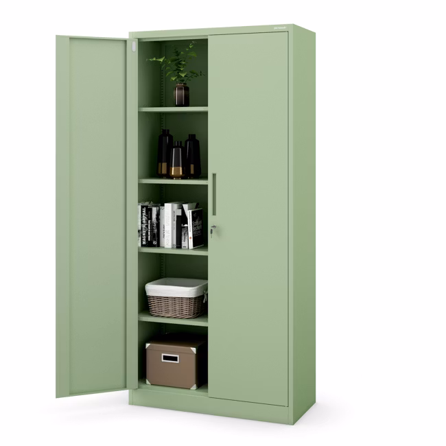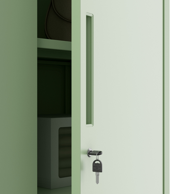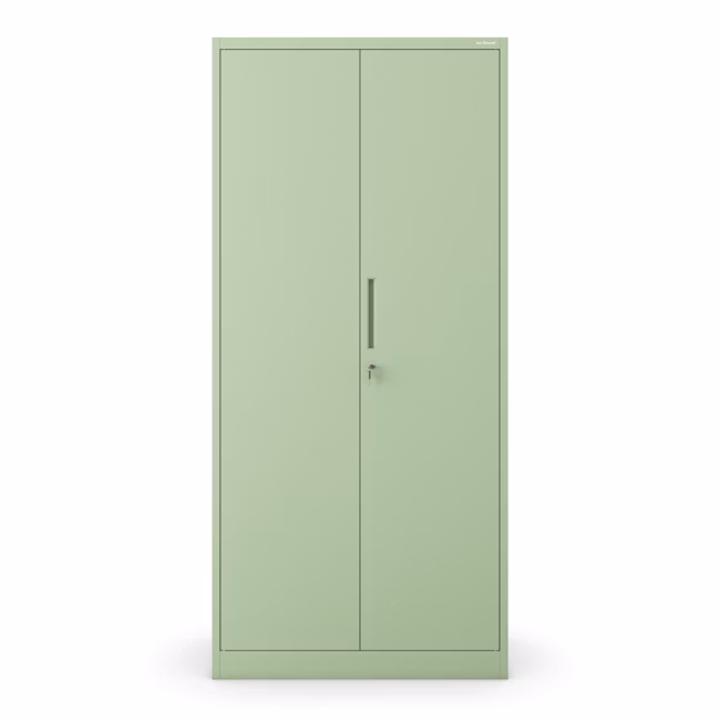 JAN H ist ein klassischer zweitüriger Schrank mit Einlegeböden im Inneren. Er zeichnet sich durch seine erhöhte Höhe (195 cm) aus, so dass man wirklich viel in ihm aufbewahren kann. Lösungen aus Metall sind hinsichtlich der Festigkeit, Solidität und Wartungsfreundlichkeit konkurrenzlos. Das Modell JAN H in einem einzigartigen pastellgrünen Farbton wird sich zu Hause, im Büro, aber auch in der Firma bewähren.