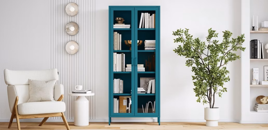 La vitrine métallique ANGELO attire l'attention par sa teinte attrayante couleur azur, qui permet d'obtenir un aménagement d’intérieur intéressant. La peinture Sparkling Brilliance™, scintillante de petits éclats, complétera la décoration du salon et sera elle-même une décoration discrète de style bijou.