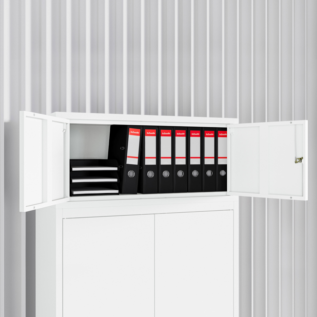 A fém szekrényfeltét rengeteg helyet kínál a ritkábban használt tárgyak tárolására, például dokumentumok, irattartók vagy munkaruhák számára. Ideális megoldás, ha biztonságos, de plusz tárolóhelyre van szükség. Az EWA Compact modell erős kulcsos zárral rendelkezik, amely megóvja a tartalmat az illetéktelen hozzáféréstől, növelve a helyiség biztonságát.