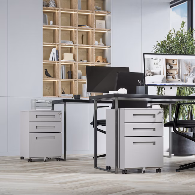 Il contenitore in metallo KATE, alto 600 mm, si adatta perfettamente a spazi ristretti in ufficio o in casa. Grazie alle sue dimensioni compatte, si inserisce facilmente sotto la scrivania e non occupa spazio supplementare. Può anche fungere da mobile indipendente – la parte superiore è perfetta per cartelle o vaschette portadocumenti. Le ruote consentono uno spostamento facile e senza sforzo.