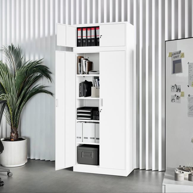 Il sopralzo in metallo offre molto spazio per riporre oggetti utilizzati meno frequentemente, come documenti, raccoglitori o abiti da lavoro. È la soluzione ideale per chi cerca uno spazio sicuro ma aggiuntivo. Il modello EWA Compact è dotato di una serratura solida con chiave, che protegge il contenuto dall’accesso di persone non autorizzate e aumenta la sicurezza dell’ambiente.