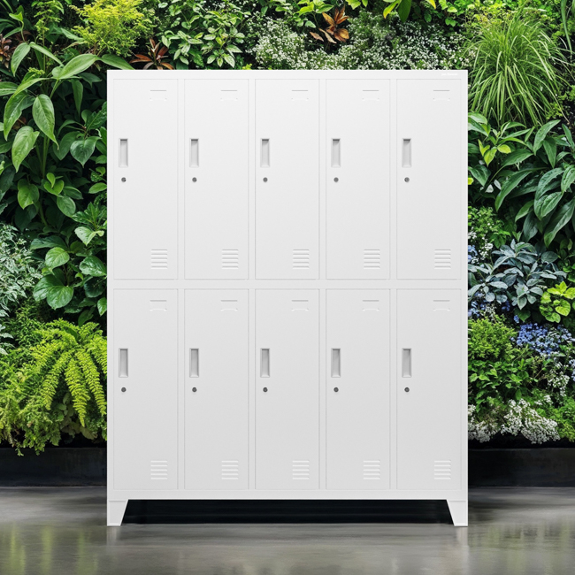 Elk compartiment is uitgerust met een grendelslot. Dit zorgt voor volledig veilige opslag van waardevolle spullen (portemonnee, telefoon) of vertrouwelijke documenten. Dankzij de afzonderlijke afsluitbare ruimtes kunnen 10 personen tegelijkertijd van privacy profiteren, wat het gebruik van de personeelsruimte efficiënt maakt.
