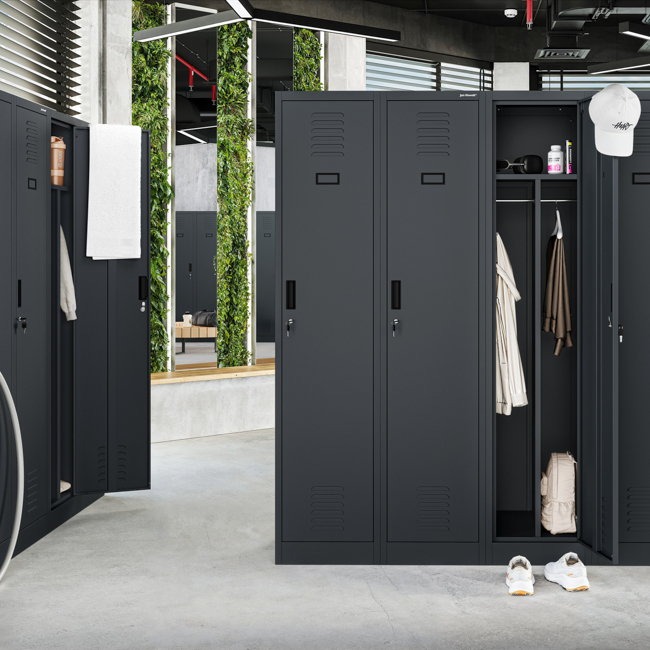De personeelskast is uitgerust met betrouwbare sloten voor veilige opslag van persoonlijke bezittingen en waardevolle items. Je kunt er zonder zorgen je portemonnee, telefoon of belangrijke documenten in bewaren. Dankzij de sloten op beide deuren kunnen twee personen elk een privéruimte gebruiken.