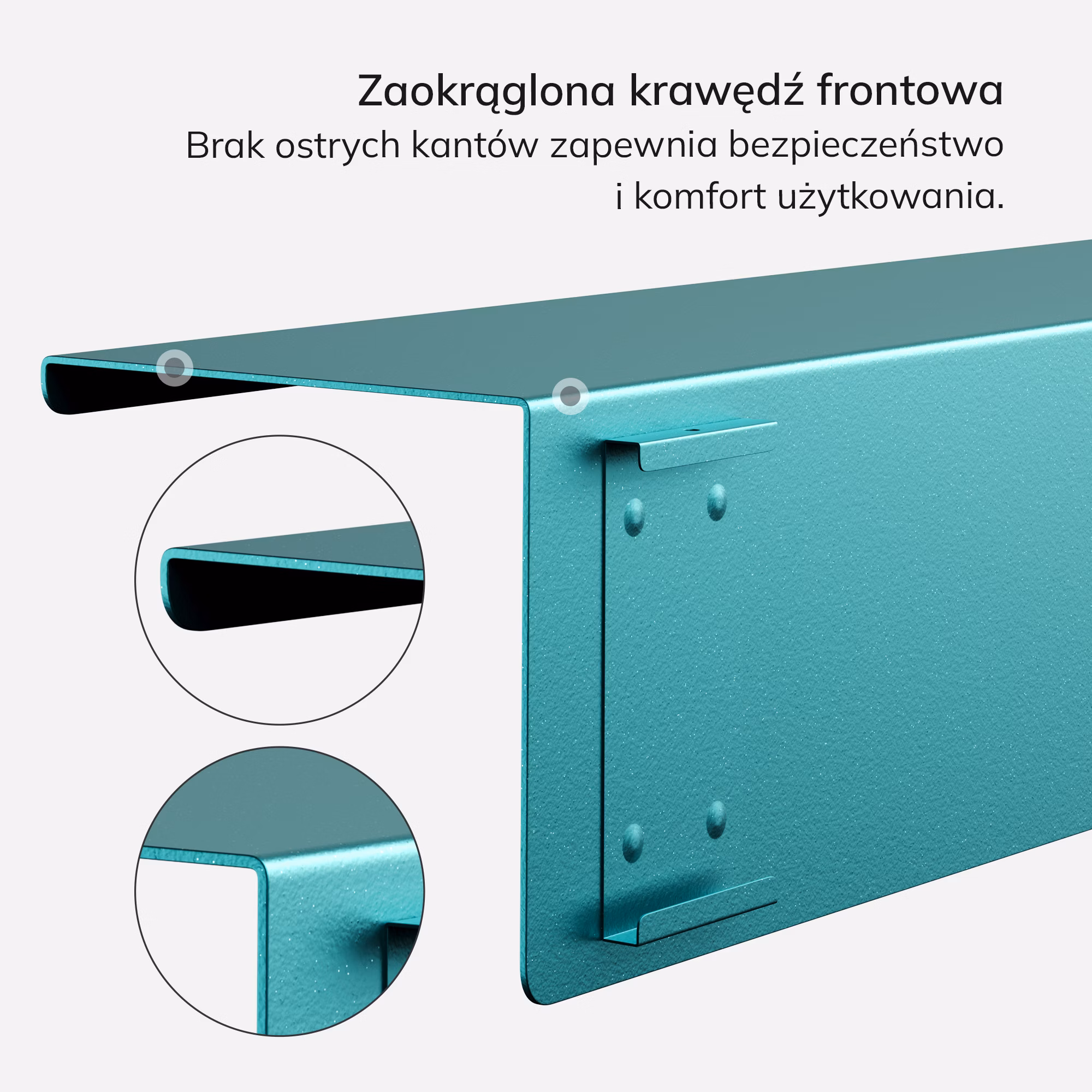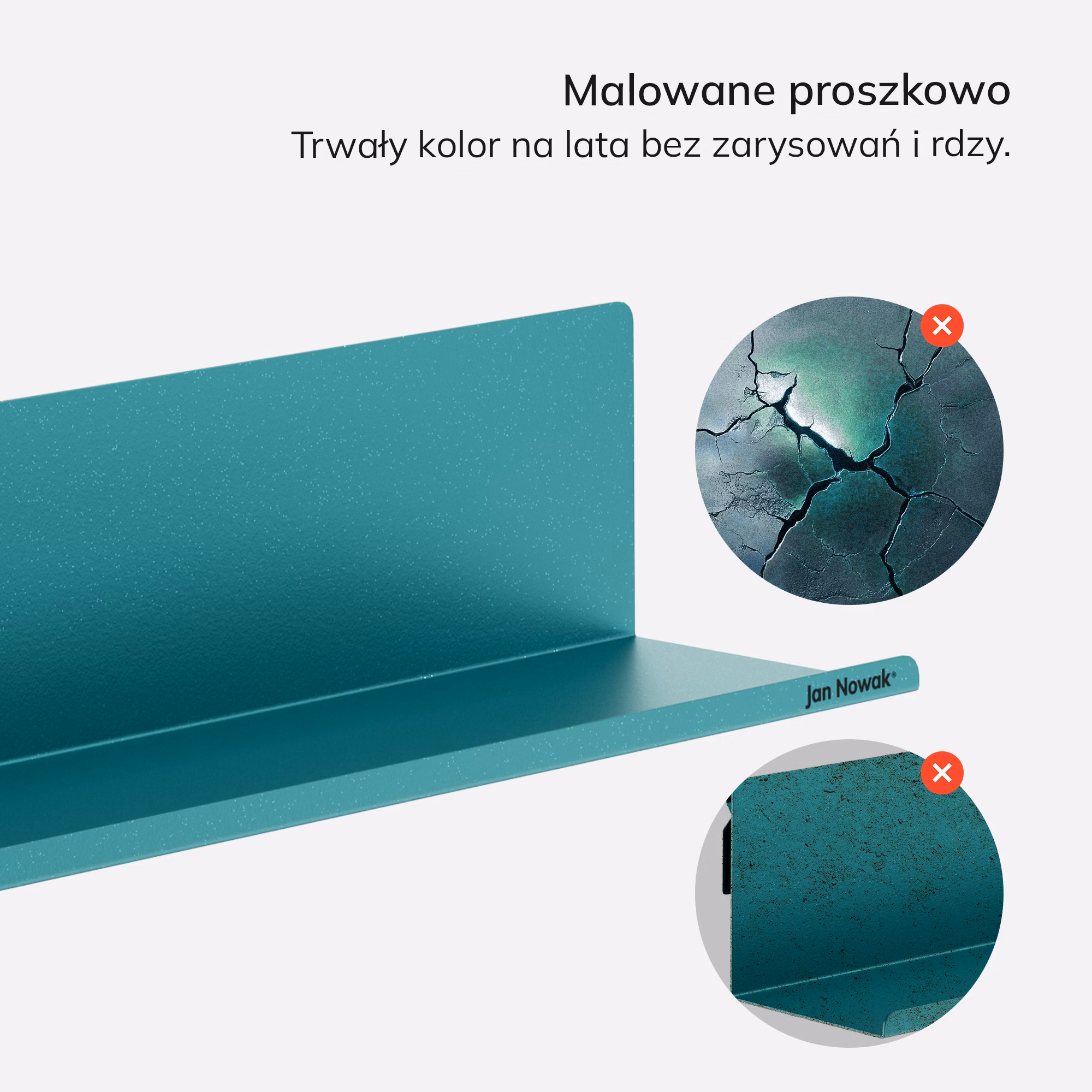 Minimalistyczna półka wisząca JOANNE to wyjątkowe połączenie funkcjonalności i stylu. Przyciągający wzrok piękny i wyrazisty morski kolor z błyszczącymi w świetle iskierkami, uzyskany dzięki farbie Sparkling Brilliance™, nadaje wnętrzu świeżości i elegancji. Ścienna półka doskonale uzupełni aranżacje w klimacie modern i doda charakteru przestrzeni domowej lub biurowej. Zapewnia wystarczającą przestrzeń do przechowywania książek i potrzebnych akcesoriów oraz eksponuje dekoracje.