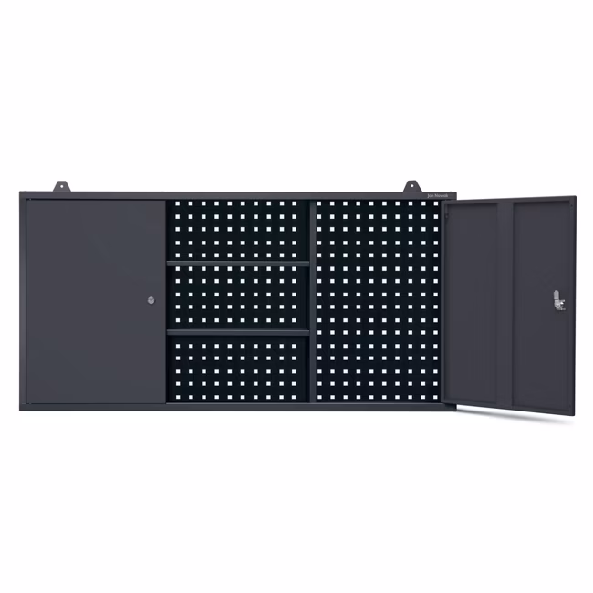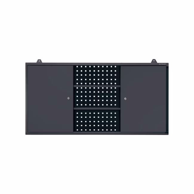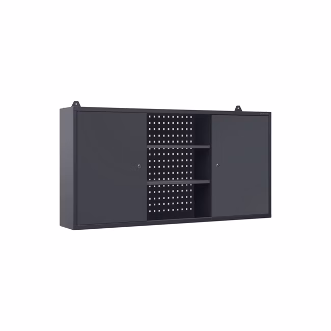 În dulapul BEN s-a aplicat o împărțire practică în 3 zone. Cele două uși laterale sunt compartimente închise cu cheie, iar în mijloc rămâne un spațiu deschis cu rafturi. Acest lucru oferă mari posibilități de organizare a locului și de aranjare practică a obiectelor necesare. Un mare avantaj este placa perforată pe spatele dulapului. Aceasta are găuri speciale care permit agățarea uneltelor utile. Astfel, le veți avea mereu la îndemână.