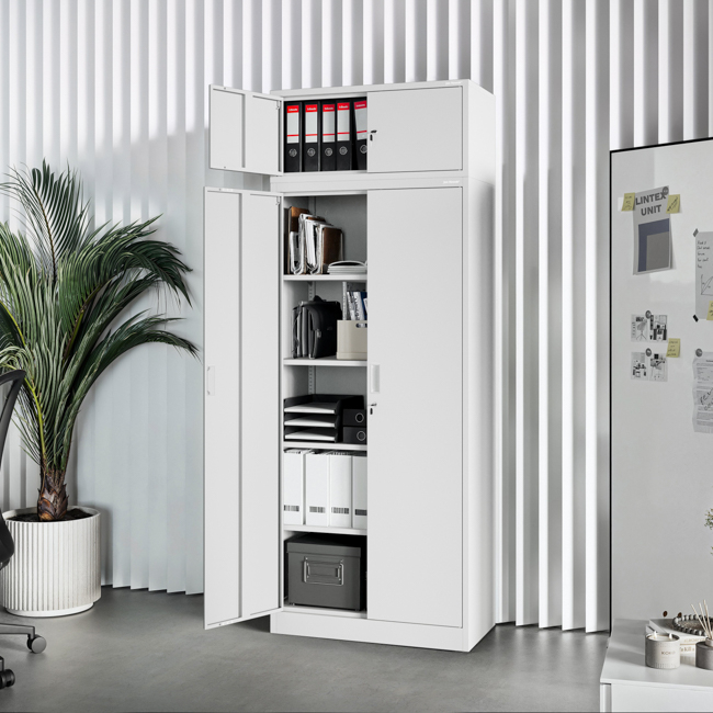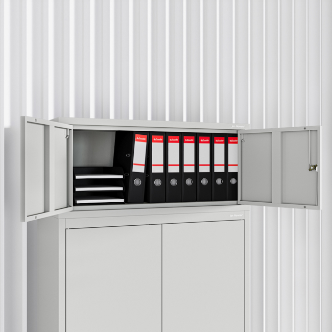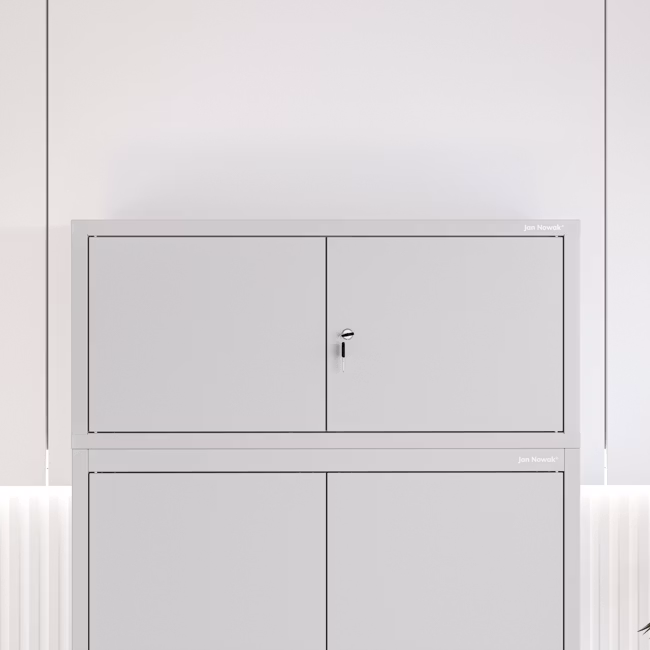 Această suprastructură metalică oferă spațiu generos pentru diverse obiecte precum bibliorafturi, documente sau echipamente de lucru. O soluție excelentă pentru obiectele utilizate ocazional, care nu trebuie să fie la îndemână în fiecare zi. Este echipată cu o încuietoare solidă cu cheie, care protejează eficient conținutul împotriva accesului neautorizat, sporind nivelul de siguranță.